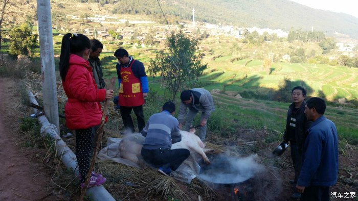 路过一个村子时,村名正在杀猪呢!女儿居然不怕??还认真的瞧着!