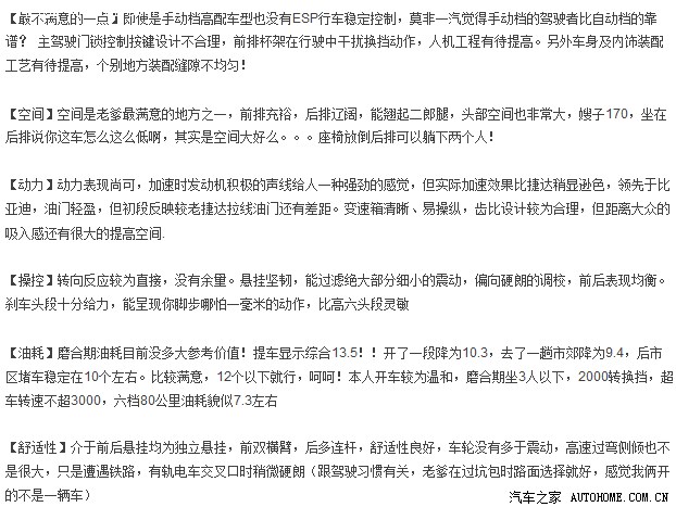 这个...这个车头给我的第一感觉有点怪异,不过看习惯了也就觉得顺理成章了。最吸引我的是D柱那个大大的X!有点英菲尼迪的感觉。侧面线条简洁,车尾浑然一体,很漂亮,不过感觉后窗的视野有些小。车内造型比较中庸,一条亮色的装饰给人以运动的感觉,不错。方向盘造型稳重,空调、音响布局合理,只不过空调第一排按键稍显集中(有回在人民大街上行驶凭感觉切换外循环和内循环,结果按到座椅加热键了,堵了一个红灯就如坐针毡了,加热还挺快)