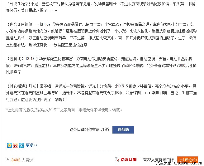个人觉得是一款里程碑似的作品,定位恰当,产品线众多,销量大。因为小弟目前在和河北邯郸工作,街上跑得SUV除了起亚就是H6,而且车主的反映,尤其是媒体对H6的评价颇高,值得关注。
