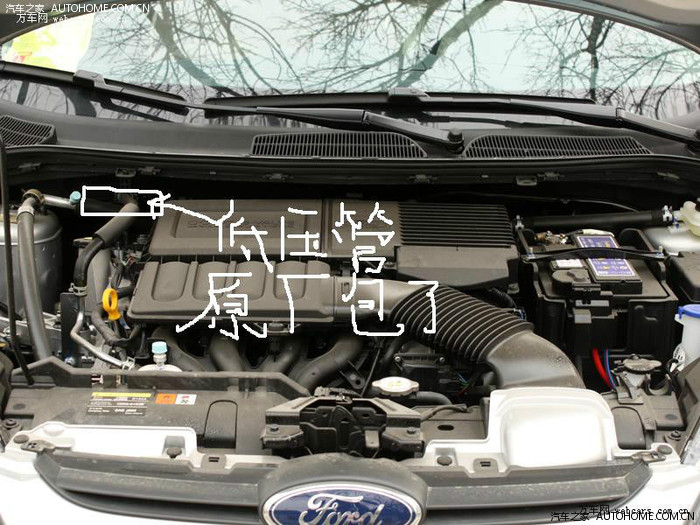 (老老款嘉年华高低压管是分开的!图中白色所圈这根管子就是低压管,原厂就带保温隔热层包裹!其包裹部位大部分在发动机后面,图片上只能看到白色圈的一小节!