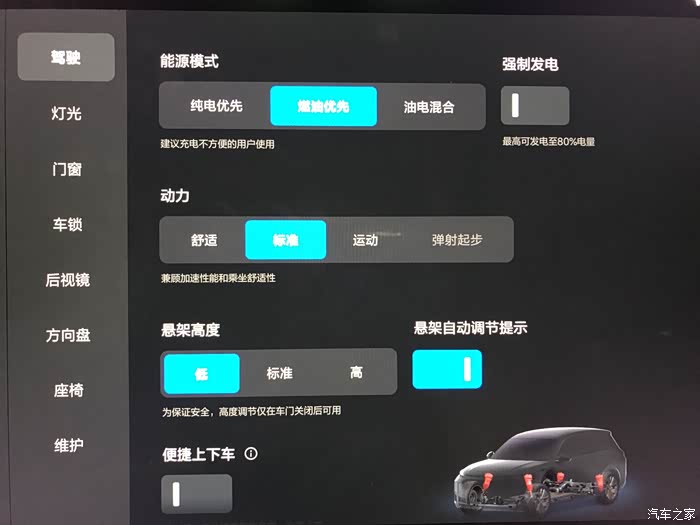 多种供电模式,使得L8具备多种能源模式可供在不同工况下进行选择。理想官方提供了纯电优先、燃油优先和油电混合三种能源模式(如果认为强制纯电、强制发电也是一种模式的话,那就是五种模式),分别对应有家用充电桩、无法安装家用充电桩但公共充电方便、没有方便的充电条件三种使用场景。