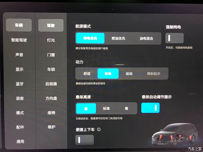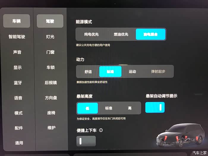 如果是高速的长途出行,建议满油满电出发,直接选择燃油优先模式就好了,电池电量会保持80%左右,如果遇到堵车的情况,可以调整为纯电优先或者油电混合,减少能耗。快接近目的地时,如果目的地附近有充电桩,可以调整为纯电优先模式。建议长途出行时保持电池电量在50%以上。