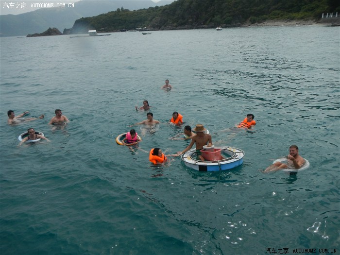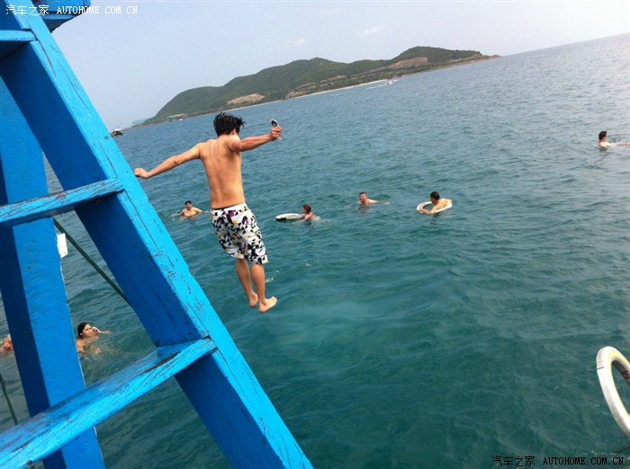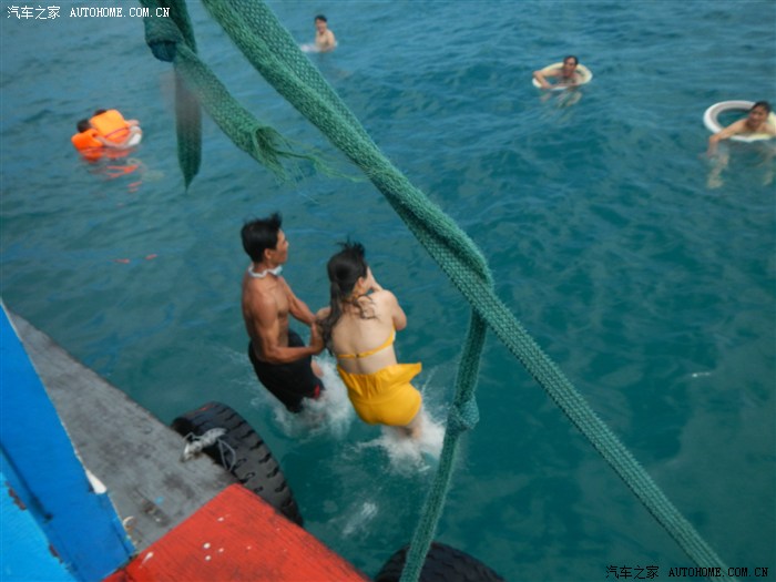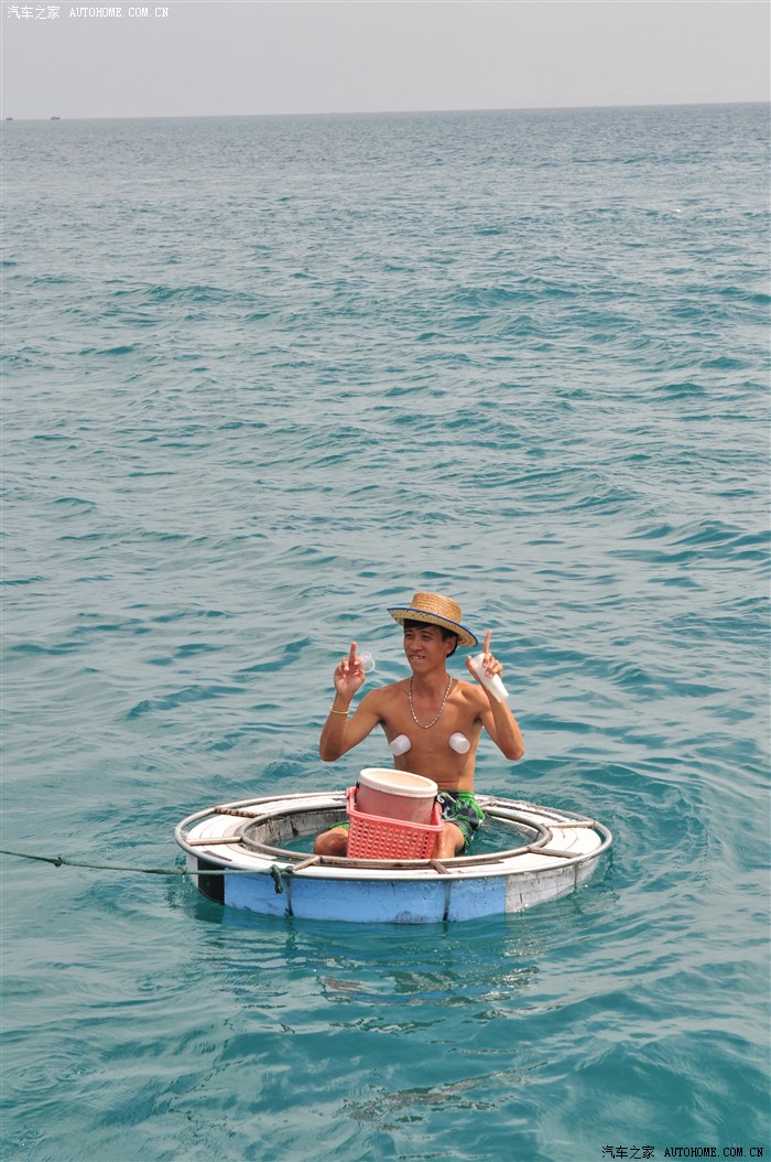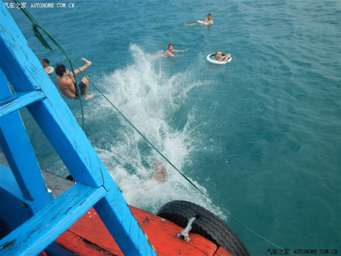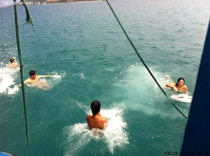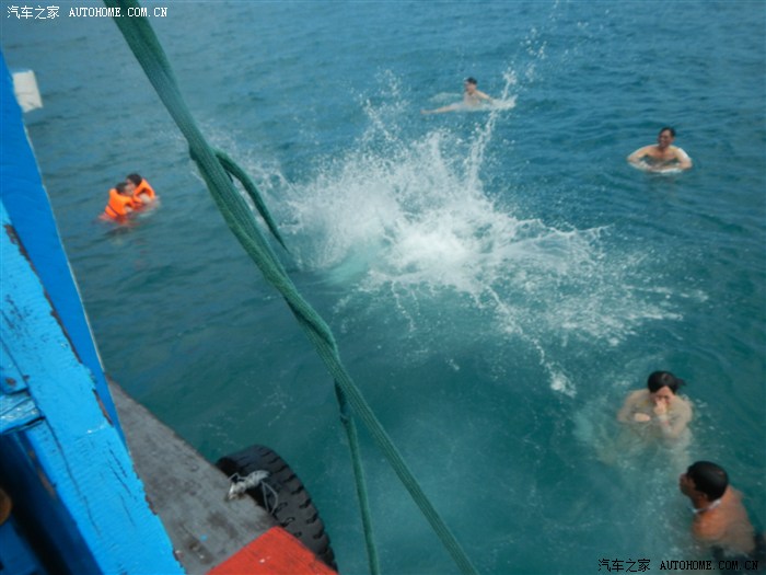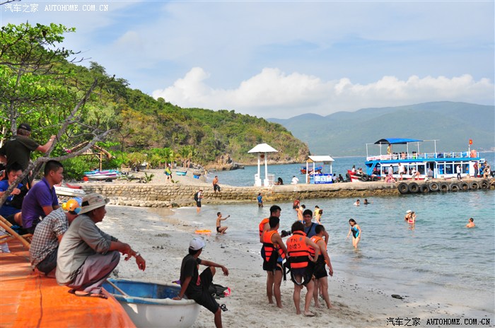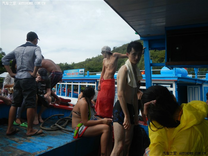出发了,海水绿绿的,个人感觉比岘港好很多.大家都把比基尼套在里面,准备随时下海.当然,在船上也能换装!