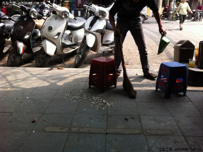 每走一桌客人,他们就会把地扫干净.小板凳码好放一边.来的客人若骑着摩托,这种街边小店都有泊车服务