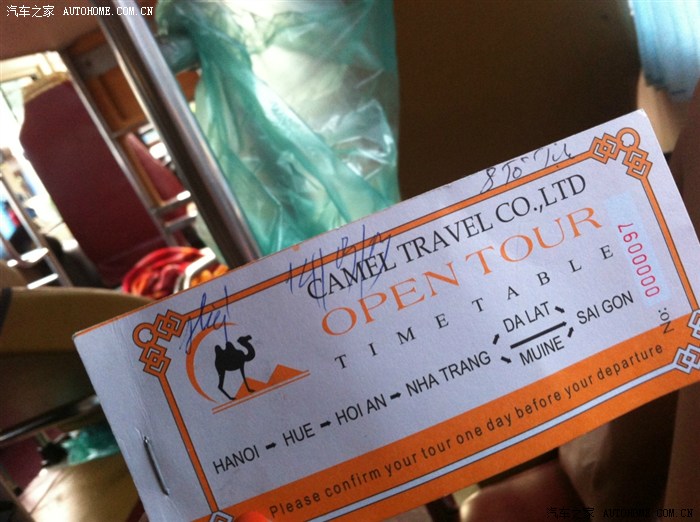 这就是我们的大巴联票了,在河内本来以为酒店给定了scafe的车票,结果拿到手发现是骆驼公司的.在此曝光一下!千万不要定除了scafe以外其他家的bus票,而且要亲自去找正宗的scafe店,因为越南遍地都是山寨这家的店!这家骆驼公司,服务态度超级差,从预定处到司机,没一个好人啊...司机完全不理顾客的询问,就知道说nonono.订票处脸拉得和死了亲爹一样.现在我们上车赶往芽庄,居然不让我们上车.让所有当地人先上,等我们上去以后,第一排的位置还不让我们坐,也是留给后面上车的当地人!差评!