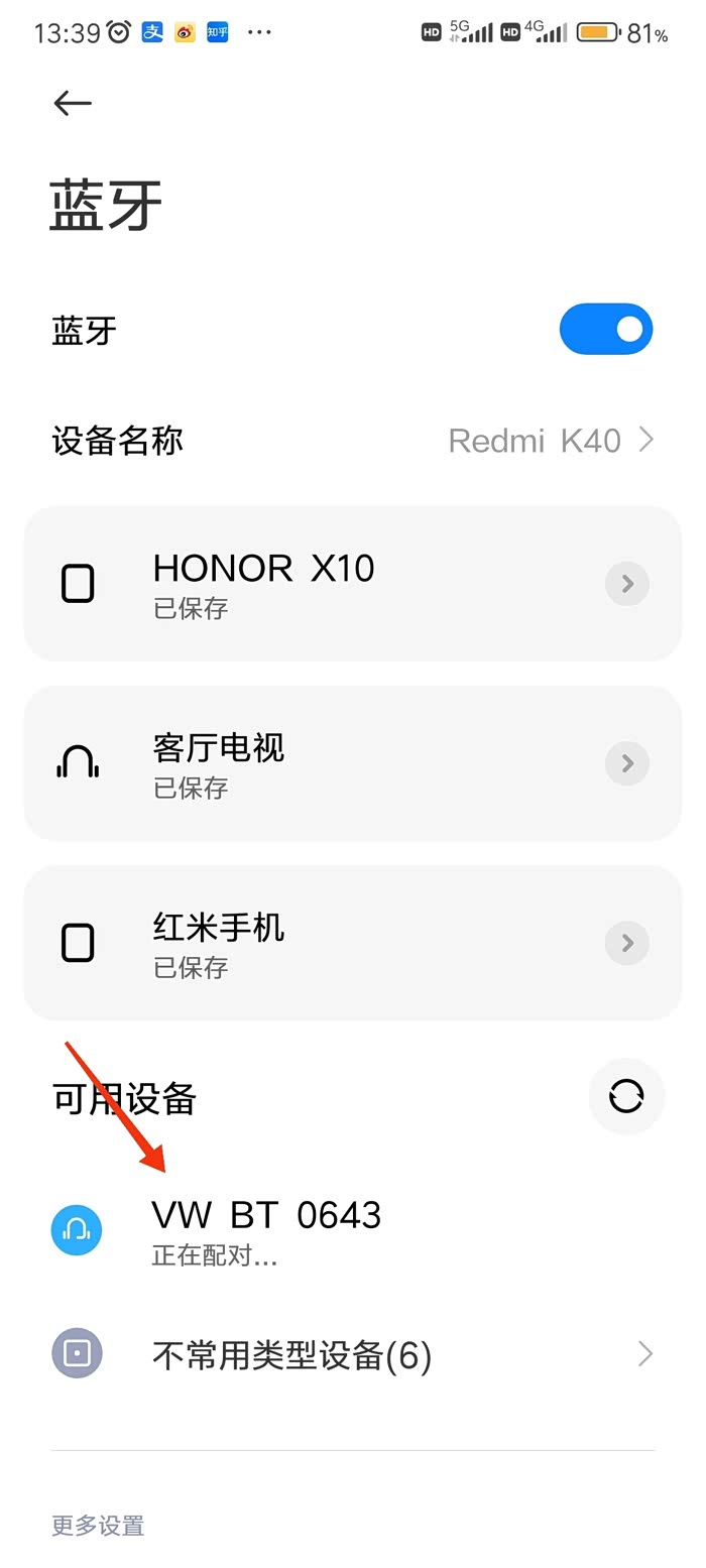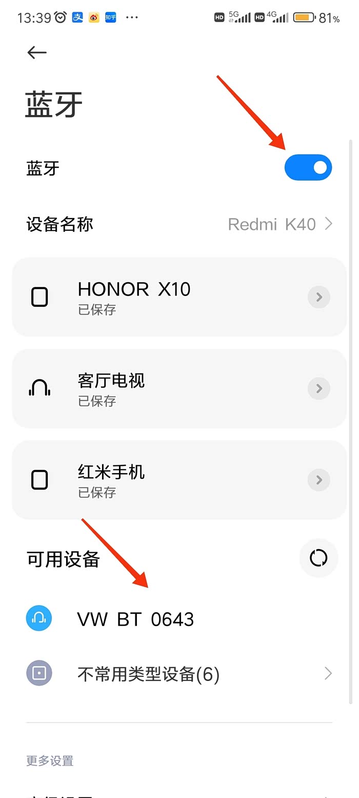 1.在手机的设置里面找蓝牙,打开蓝牙界面后,拨动蓝牙功能开关,打开蓝牙,一会在下面的可用设备列表里面就会出现v w开头的音频设备。