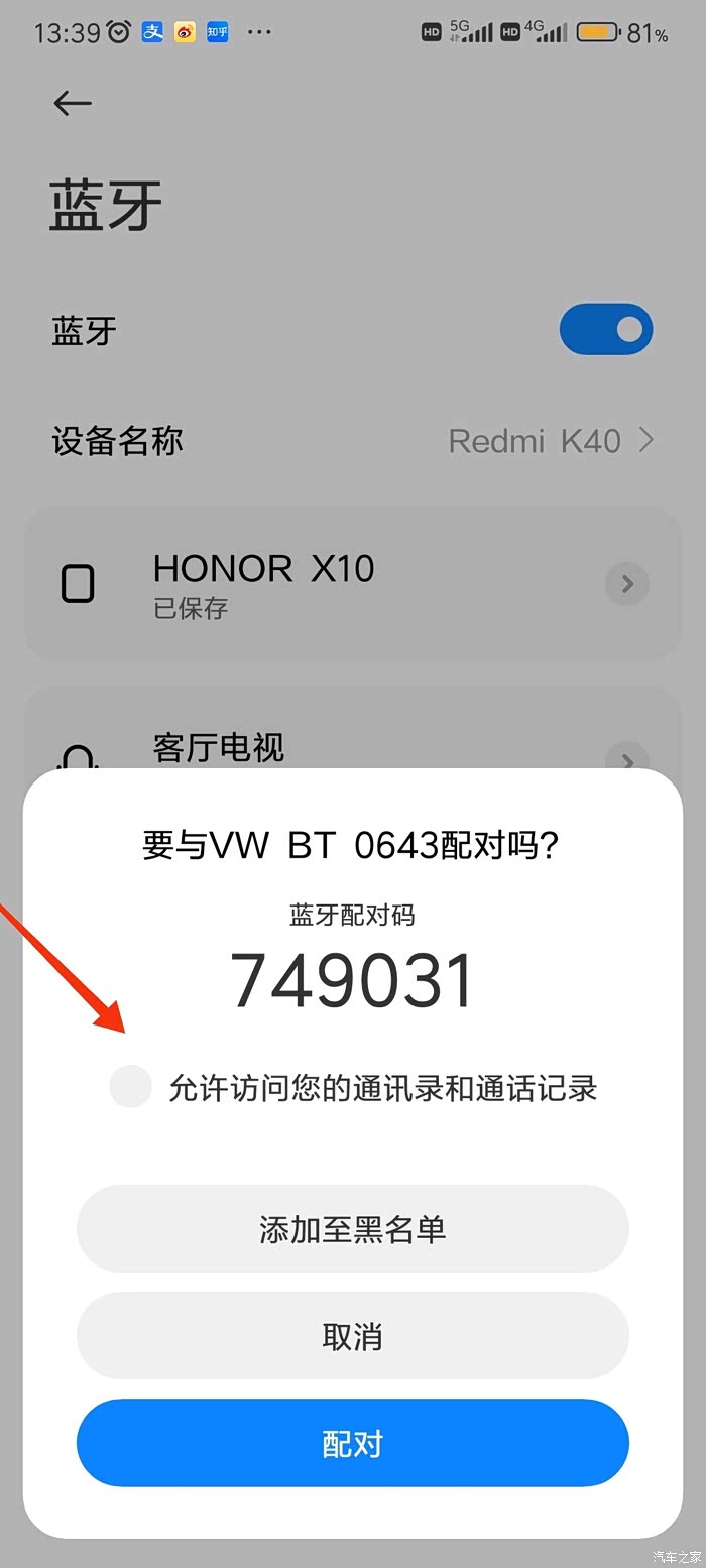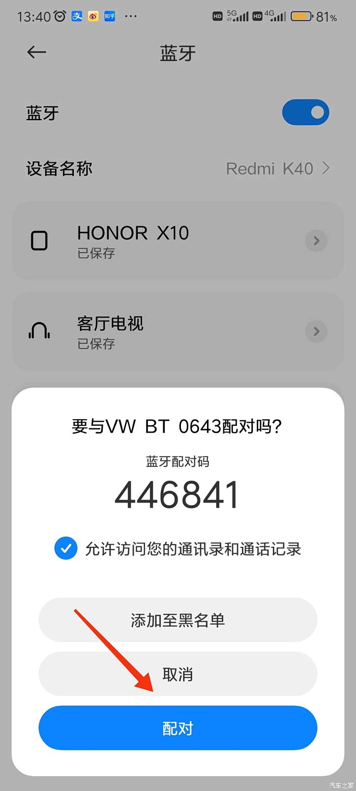 2.点击该音频设备,就会出现配对的连接卡片,记得要点选上面的“允许访问您的通讯录和通话记录”,不然连接后车机无法读取手机的通讯录,也无法使用语音功能拨打通讯录里的电话,然后点击配对,在车机端会弹出连接的提示,点击确定,手机就会提示正在配对,一会就会连接成功。
