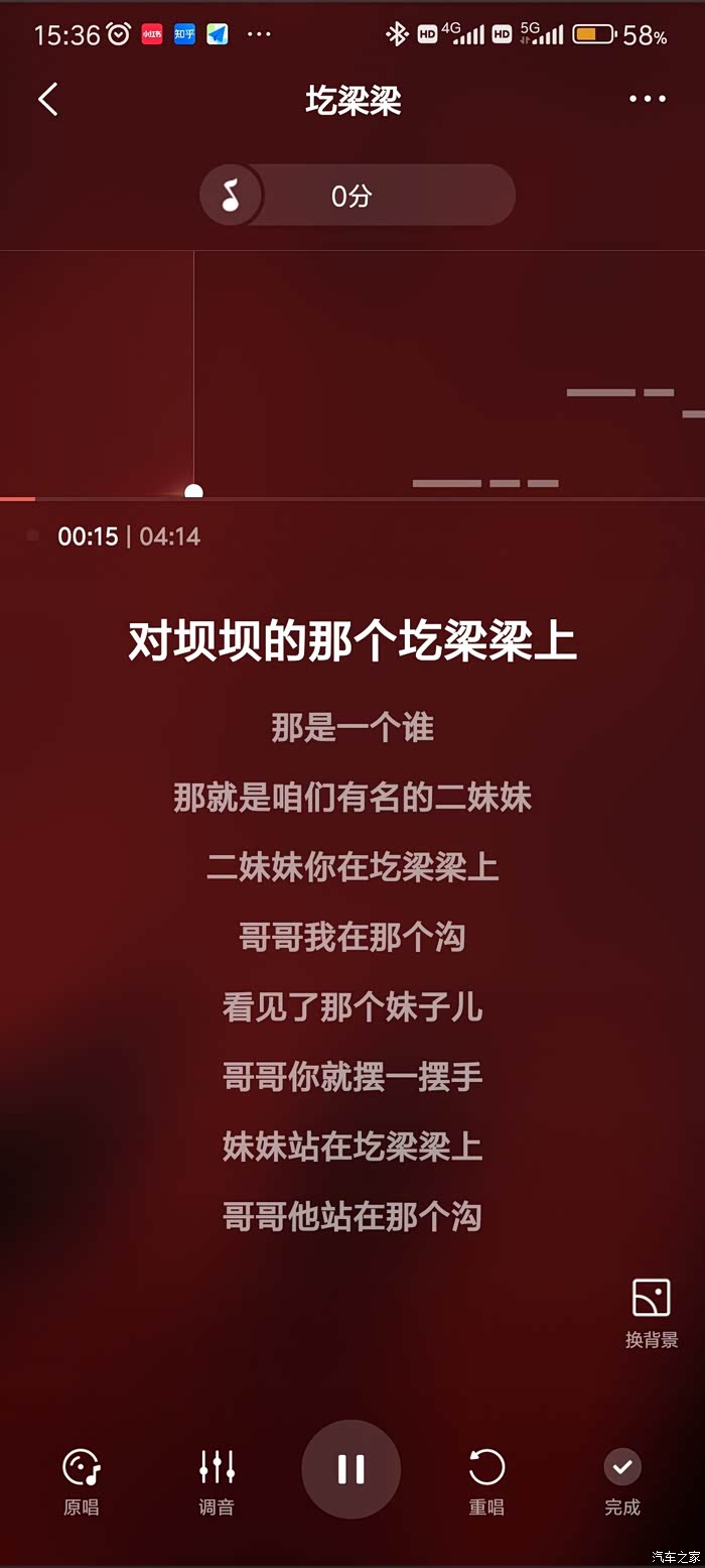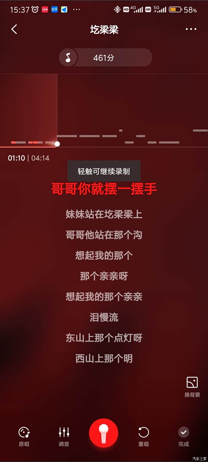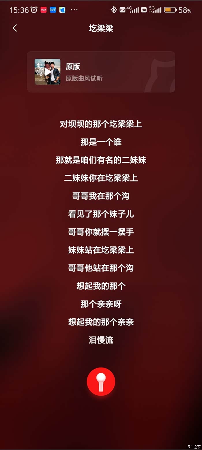 2.关上车窗,打开喜欢的歌曲,点击下方的麦克风按钮,车机就会播放音乐,按照歌词提示尽情的唱吧,手机会自动录制,最后选择各种场景效果,选择保存,然后播放录制的歌曲,车机里会想起你激昂的歌声。