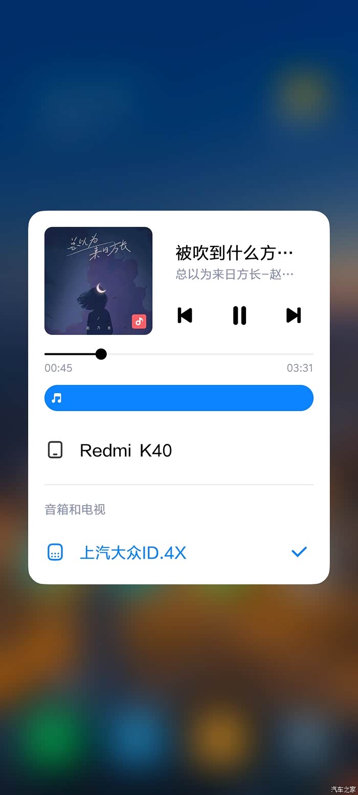 1.蓝牙连接时,打开手机里的需要播放的音乐,在播放器界面确保音频输出显示为车机,我把车机的名称改了一下,所以显示上汽大众ID.4X。