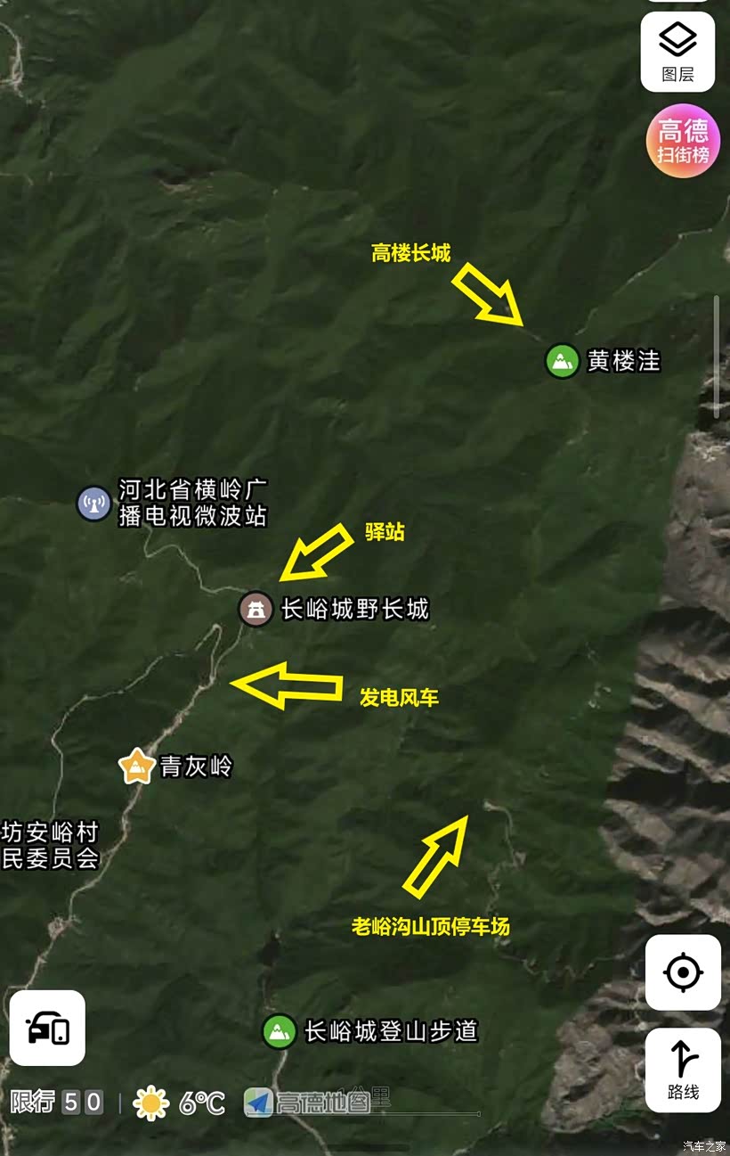 。此处地处深山,手机信号时有时无,高德地图能显示出大概路径,根据路径加上山中被踩出来的路走就成了,中涂有一个岔路,注意看地图。沿着路,直接能到达高楼长城。