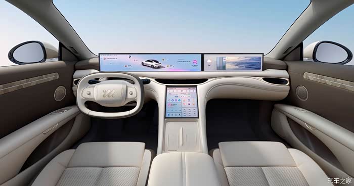 坐进车内,新款智己L6最大的改变是联合中央圣马丁定制了全新的丝绒轻羽木纹饰板,触感更加的细腻,视觉效果更为优雅。新的方向盘造型一改老款车型争议颇大的半幅设计,而是采用了椭圆形全辐的造型,既融合了半辐方向盘开阔的视野,也拥有了全辐方向盘更安全舒适的握感。此外车内还采用了前后排256色氛围灯以及多元艺术纤维花纱顶棚,一定程度上提升了车内的感官品质