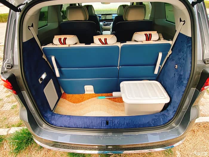 帝王蓝配色的翻毛皮,贴了两前门相当于防踢垫的作用,后备箱盖,后备箱两侧饰板均翻毛皮覆盖,两个目的,一个是为了好看,第二为了防止浅色饰板刮花和脏污!三排座椅靠背本来也打算贴一层,后盖感觉没有必要,这样也比较和谐!