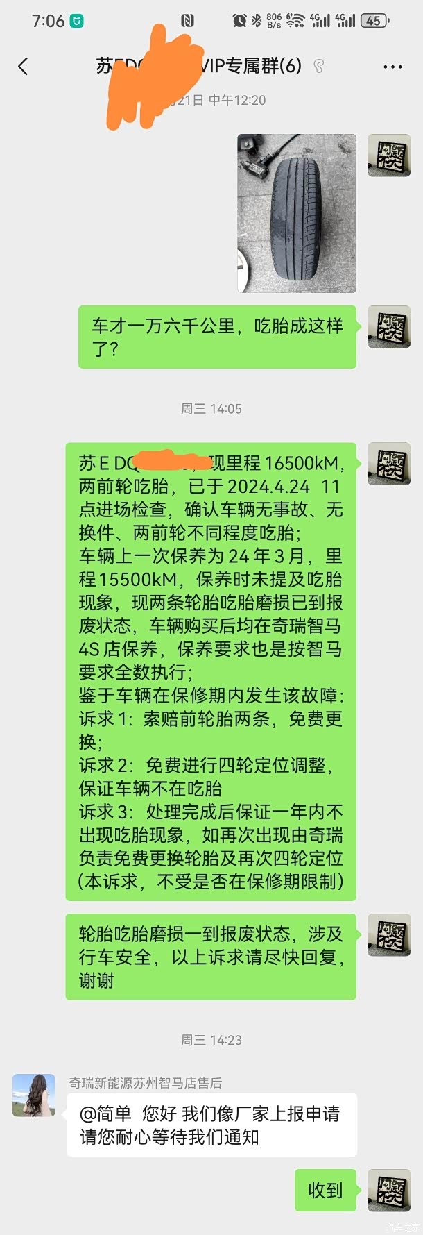 诉求3:处理完成后保证一年内不出现吃胎现象,如再次出现由奇瑞负责免费更换轮胎及再次四轮定位(本诉求,不受是否在保修期限制,如再次发生,需免费处理并延长质保一年