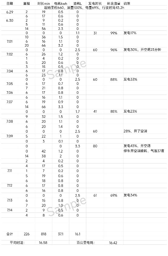 6月29日加满油了,开始下一阶段测试,测试条件不加油ev行驶,驻车发电。测试两个指标,第一是ev下城市路况开空调电耗。第二测试驻车发电一升油能发多少电。由于天气比较热,驻车发电开空调会误差很大,所以我只能用零星凉快时间驻车发电,按车表显记录,由于无法外接测量工具,除了加油量,其他都只能以表显为准。
