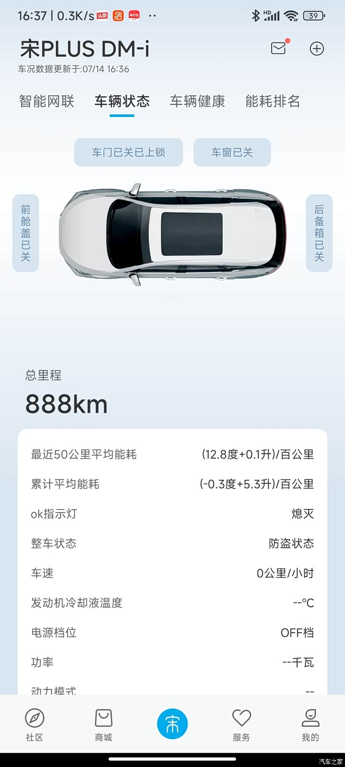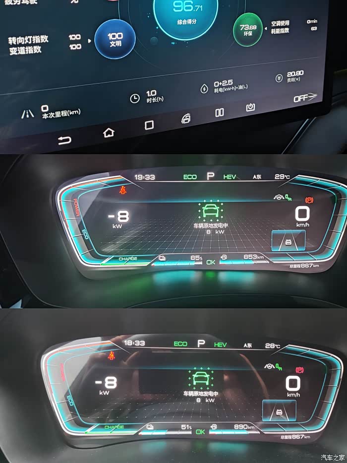 看看这个图中油耗数字是不是很好看,大多数人贴出来的油耗表现图都基本在5升左右,数字看着非常好看,但你们完全看了我两次实验的都知道,我实际没有冲过一度电,所有的电都来自油,实际这888公里一共用了52.48+17.54=70.升油,总的油耗为70/888*100=7.88升。那么为什么变这么好看,因为前660公里,显示能耗为-5.1度+7.1升,其中-5.1度电是强行显示,看过我上一个测试的都知道开始结束电量没变,根本不存在这百公里充电5.1这个东西,当你充电去ev行驶的时候,你充的电就会去填这个坑,直到你把这个坑填满。可以简单计算一下看我说的对不对,上次显示反冲电量为5.1*6.6=33.66度,现在显示反冲0.3*8.88=2.66,两者相差31度电,我一共驻车发电37度,看看是不是大致能对上?所以哪些即充电又用油的,油耗都非常好看,但这个数字根本没任何意义,完全就是骗人让迪粉自嗨的。
