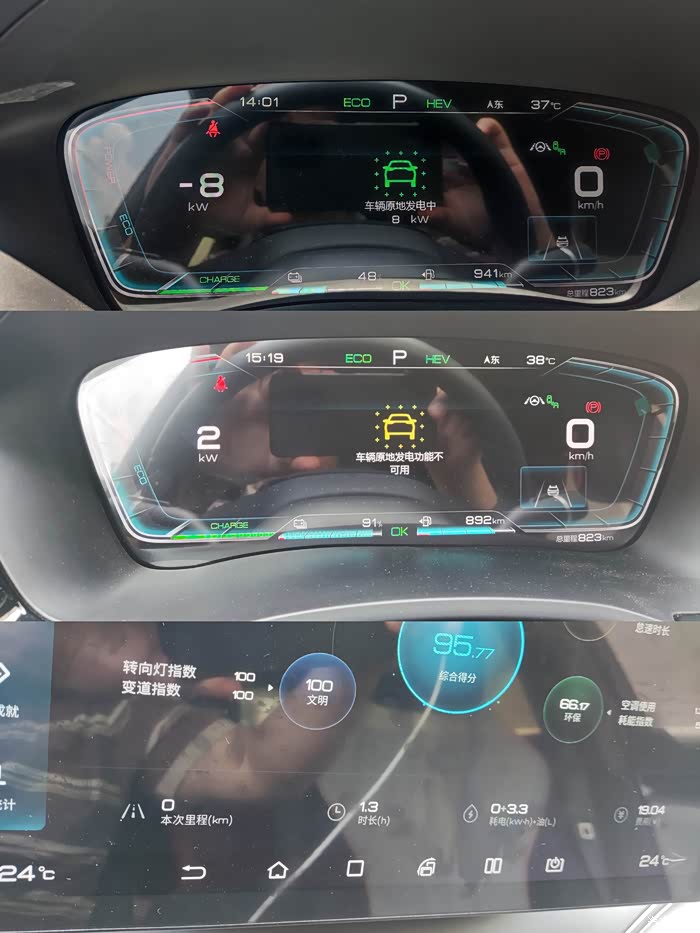 7月5日,里程758,油88%,电67%。7月4日晚驻车发电1小时,电量增加33%。