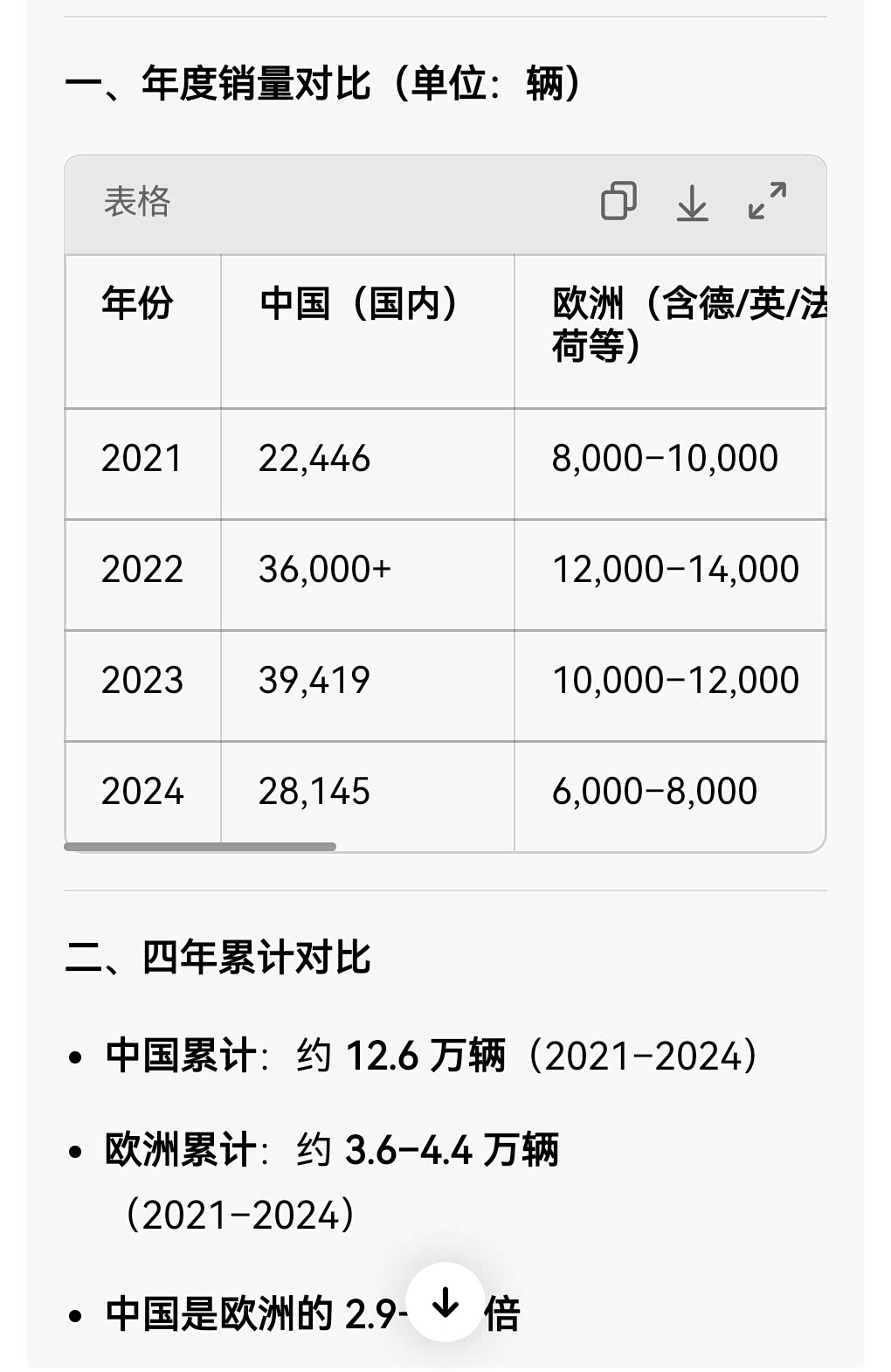 - 四年累计:欧洲总销量约36,000–44,000辆(远低于国内同期约15–20万辆)