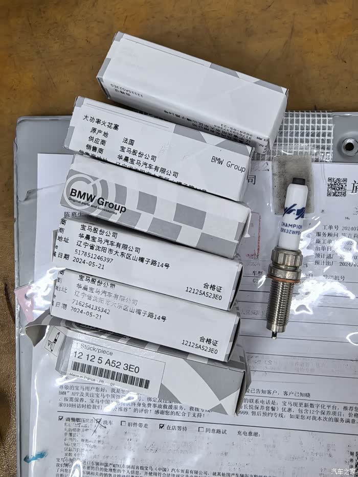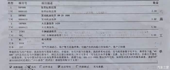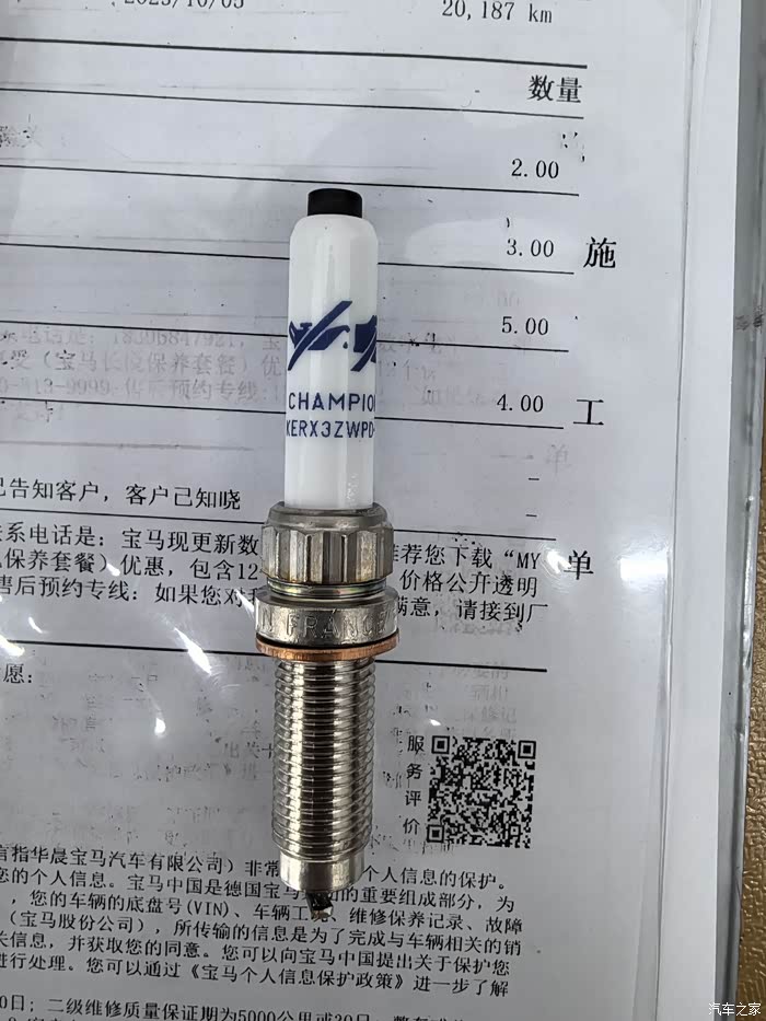 2、有车友会问,2万公里需要换火花塞吗?可以仔细看厂家指导里的备注:B系列发动(包括2.0的b48和3.0的b58)建议每两万公里更换火花塞,所以二保的时候我也更换了(主要是买车的时候有送保养券和储值卡,不需要额外付费