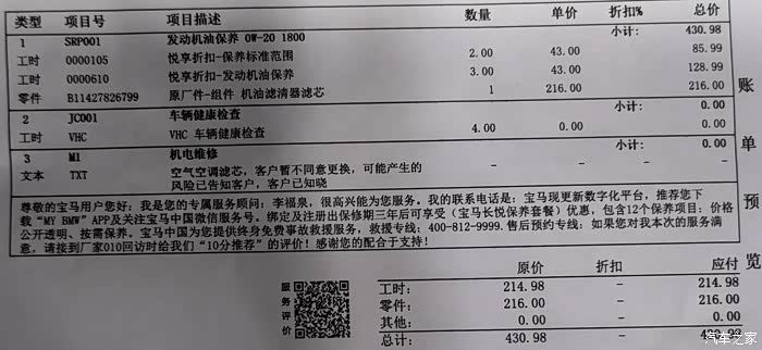 3、在4S空气滤芯和空调滤芯算上配件和工时这俩快小两千块钱了!性价比极低!所以事先从大表哥那团购了一套原厂的空气滤芯和空调滤芯。在街边找个小店花个几十块钱安上搞定,不是差这千八,而是少花冤枉钱!实际上如果不介意质量和效果,淘宝花个百十块钱也能买到不错的空气和空调滤芯,动手能力强的可以自己更换。