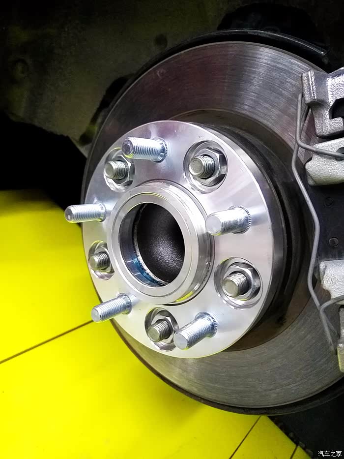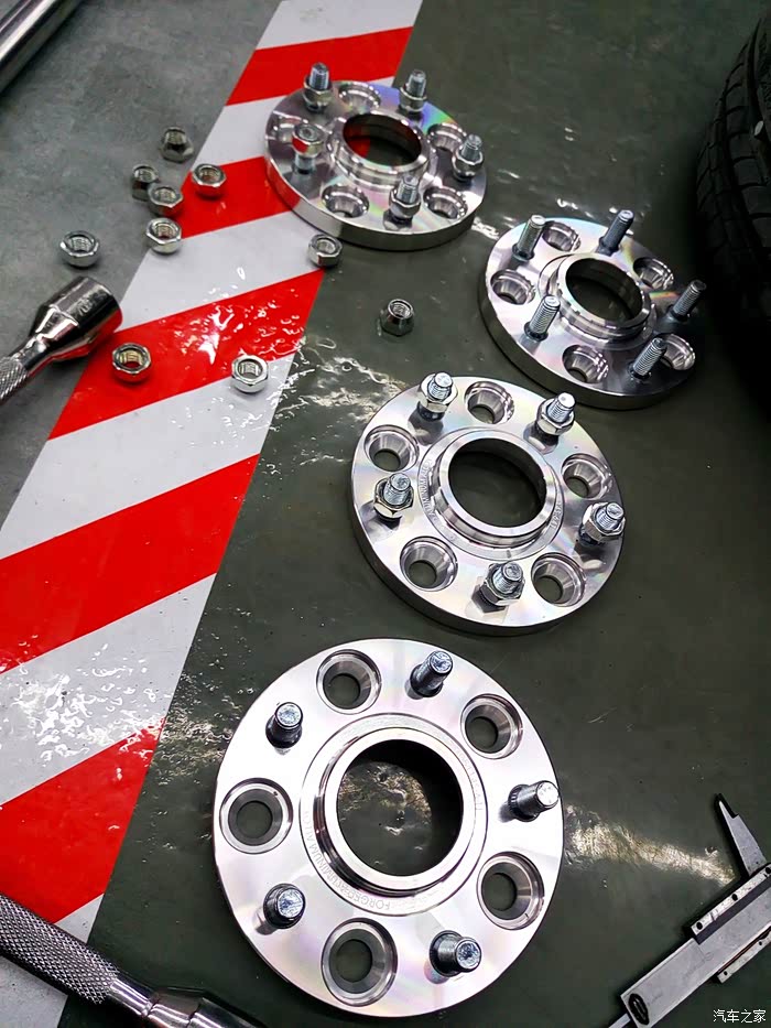 之前因为避震调了倾角之后轮毂看起来有点缩进去,于是乎,又安装一套转接法兰,5*114.3 64.1 1.5公分厚。