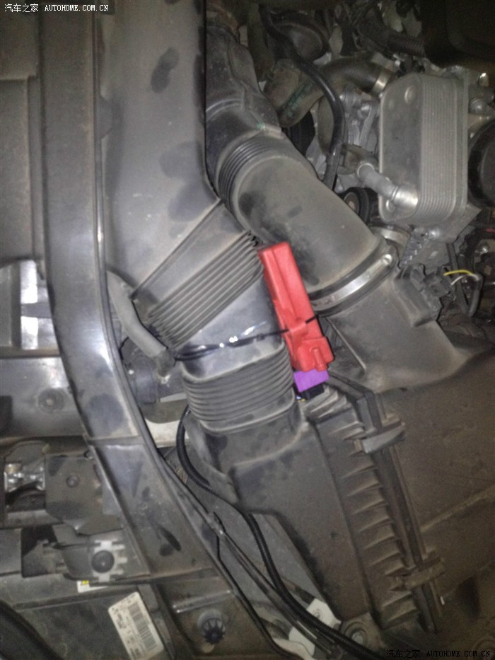 把插头的时候要注意不能硬把,插头表面有一个长方形的小凸起物,那个是一个卡口,一只手按下卡口,一只手拔插头很轻松。盒子是扎在进气管上的,线从左面走 那边算是发动机舱温度最低的地方了吧。。