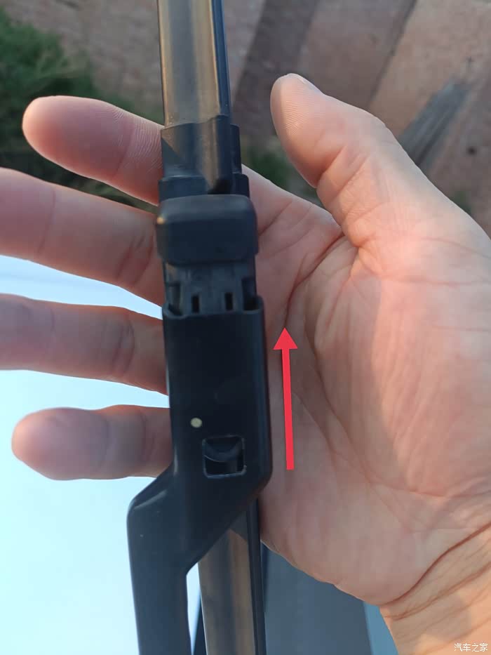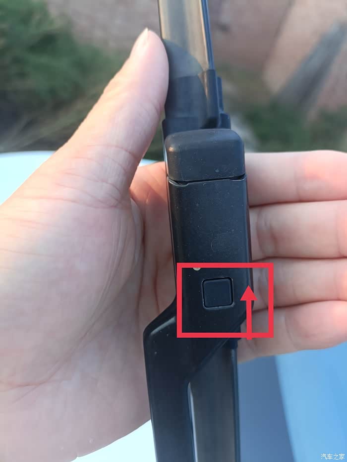 把雨刮器从前档玻璃上抬起来之后手掌握住该部位,红色标记区域就是固定雨刮器的按键位置。