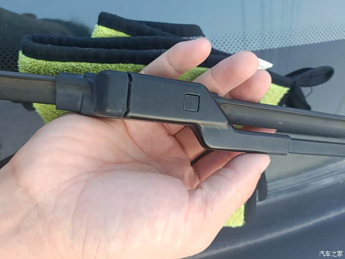 取掉雨刮器也很简单,只需要向里(手掌方向)按压方形部件即可。