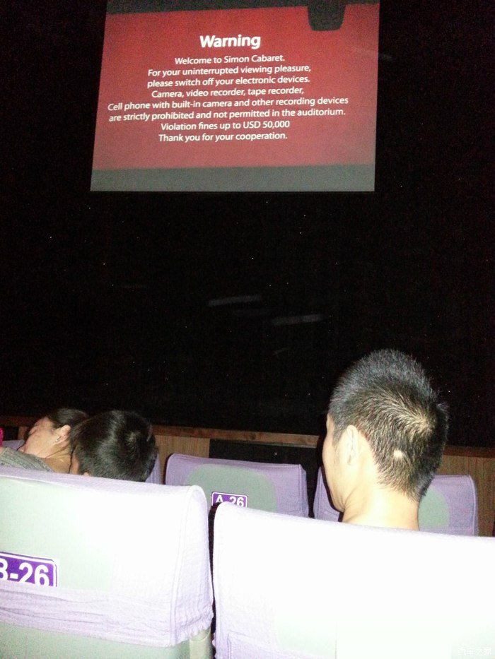 晚上去看了西蒙秀,比较精彩,与之前看的女神秀感觉差不太多,只是观众没有坐满,观众的热情也不是很高涨,没有定过道的座位,坐在过道的大哥被人妖亲了一大口,不知感觉如何