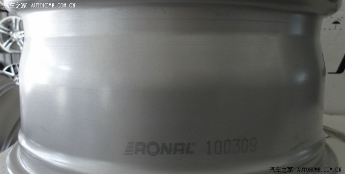 再次,也是最重要的。正品在轮毂的毂面部分(就是会被轮胎盖住看不到的地方)会有“RONAL”字样的黑色油墨印刷商标以及生产日期,这个是点网印刷的,很细致的。如果在一般的轮毂店(非4S),由于货源不稳定,4个轮毂应该不太可能是同一天生产的,也就是说生产日期的数字一般不会完全一样。