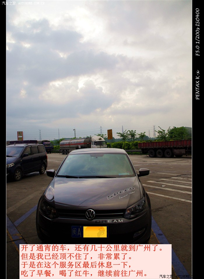 D1:7月5日 这天是周五,原计划我和冻手polo等我下班以后,下午五点从福州出发,两个人轮流开,开通宵到广州接朋友。后来冻手polo去不了了。没办法,只能由我自己一个人开通宵到广州接朋友。不知道是不是喝了红牛,一晚没睡,精神好的很。但是期间还是为了安全起见,断断续续休息了几个小时。
