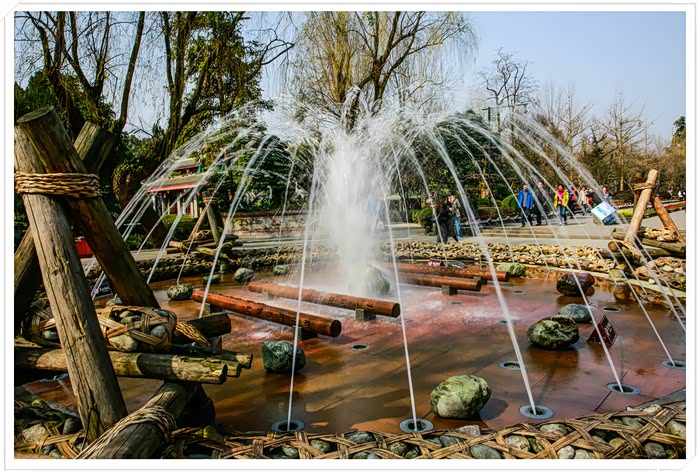 (公园内景-在前方人多处可以看到两处景点,第一个是宝瓶口,第二个便是飞沙堰,是都江堰确保成都平原不受水灾的关键要害。它的主要作用是当内江的水量超过宝瓶口流量上限时,多余的水便从飞沙堰自行溢出;如遇特大洪水的非常情况,它还会自行溃堤,让大量江水回归岷江正流。另一作用是“飞沙”,岷江从万山丛中急驰而来,挟着大量泥沙,石块,如果让它们顺内江而下,就会淤塞宝瓶口和灌区。飞沙堰真是善解人意、排人所难,将上游带来的泥沙和卵石,甚至重达千斤的巨石,从这里抛入外江(主要是巧妙地利用离心力作用),确保内江通畅,确有鬼斧神工之妙。)