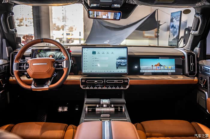作为一款硬派越野车,在科技配置方面也是不甘落后的。它搭载了三块大屏,尺寸由左至右依次为12.3英寸、15.6英寸和12.3英寸。车机芯片采用了8155型号,性能强劲,每一块屏幕都能独立操作。显示内容丰富、效果细腻、UI设计布局合理、菜单分析清晰,在操作过程中也很顺滑。
