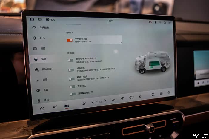 开启空气悬架功能,可以便捷上下车,还有驾驶模式的功能。