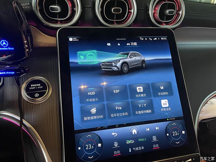 23款-25款的奔驰GLC是HU7系统,原厂抬头显示可以投射显示出来的内容非常丰富,像行车速度,地图导航,车辆的一些信息,驾驶辅助系统的信息,越野模式信息等等,还可以将整个运动模式仪表屏投射上去,非常具有科技感。