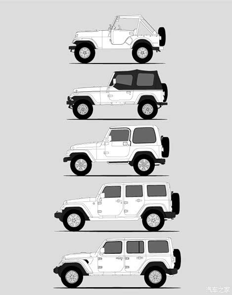 说到牧马人,功能的多样性 和 造型的简洁独特 一点也不矛盾,复杂多样的是功能,造型 追求的简洁。表象 就是 颜值,颜值就是正义。Jeep CJ、YJ 和 牧马人 侧面造型的演变,尺寸在变,简洁 独特的 造型设计没有变。