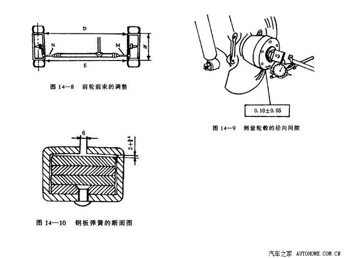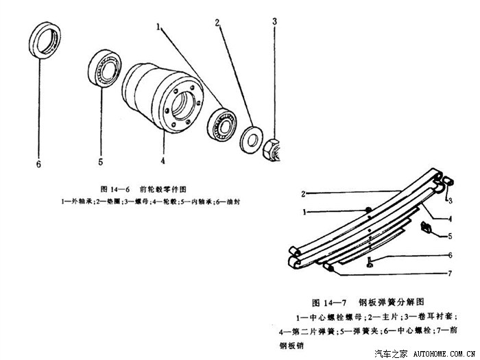 拧松车轮螺母,用千斤顶顶起汽车,拆下前轮,取出制动块固定销和压板,拆下制动器摩擦块;松开支架固定螺栓,取下制动器支架,注意不要拉曳制动软管;从制动盘上取下轮毂盖,松开制动盘固定螺栓,取下制动盘;旋出轮毅固定螺母,取下油封和垫圈,再取下轮毂外轴承和轮毂,其分解零件如图14-6。