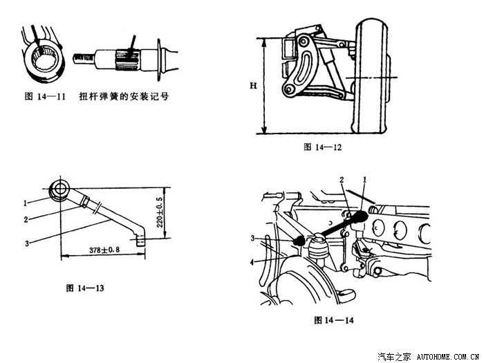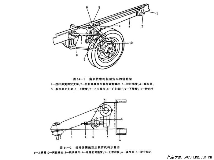 2)扭杆弹簧卸载。首先拧松锁紧螺母,并完全拆下调整螺栓。这样扭杆即已经卸载,再拆去扭杆前端上的开口销,拧下扭杆有螺纹一端的固定螺母和垫圈。