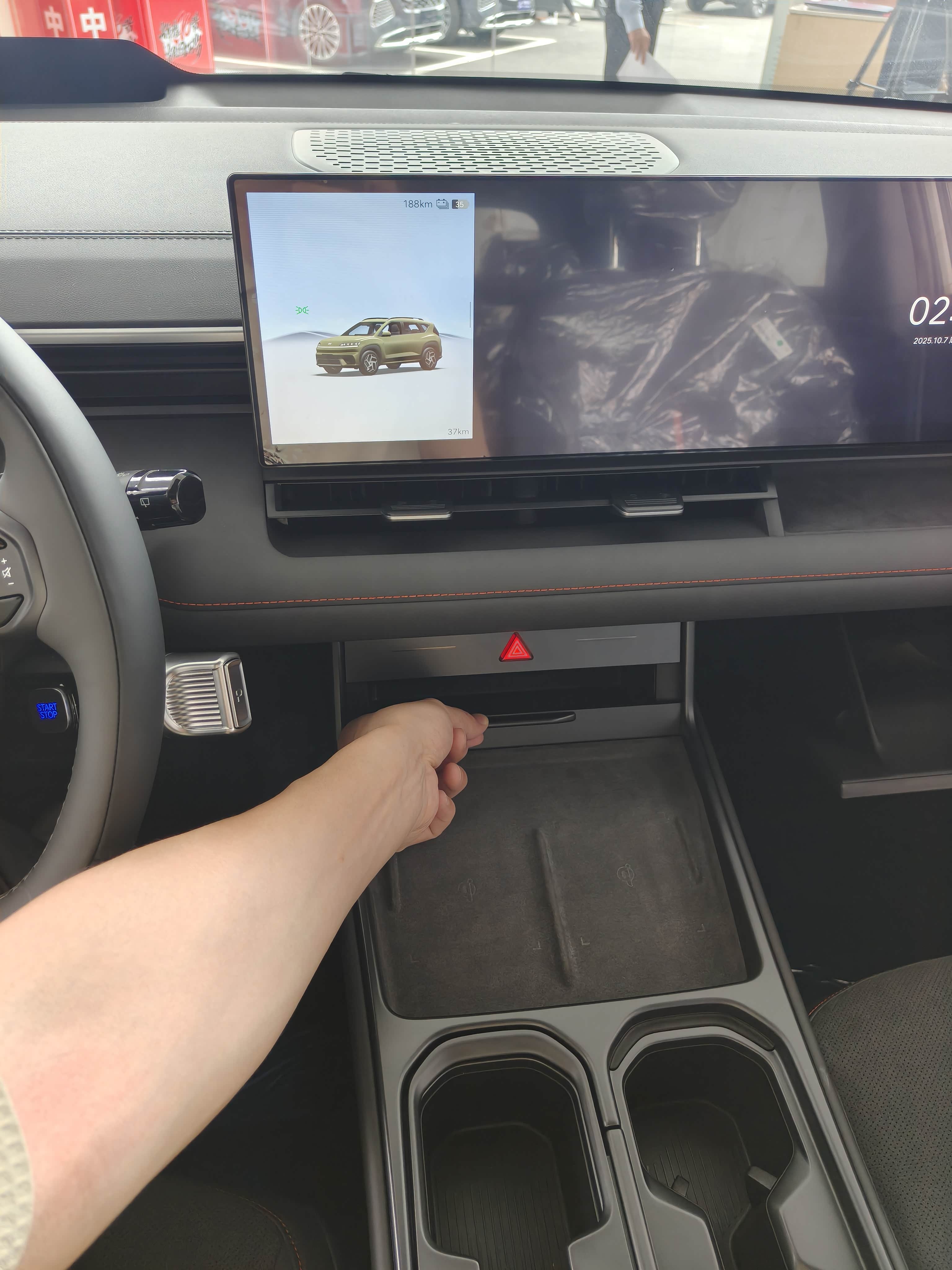 中控区塞了一个储物格,光秃秃的硬塑料盖子,开口很小、开合也费劲,没什么实用价值。