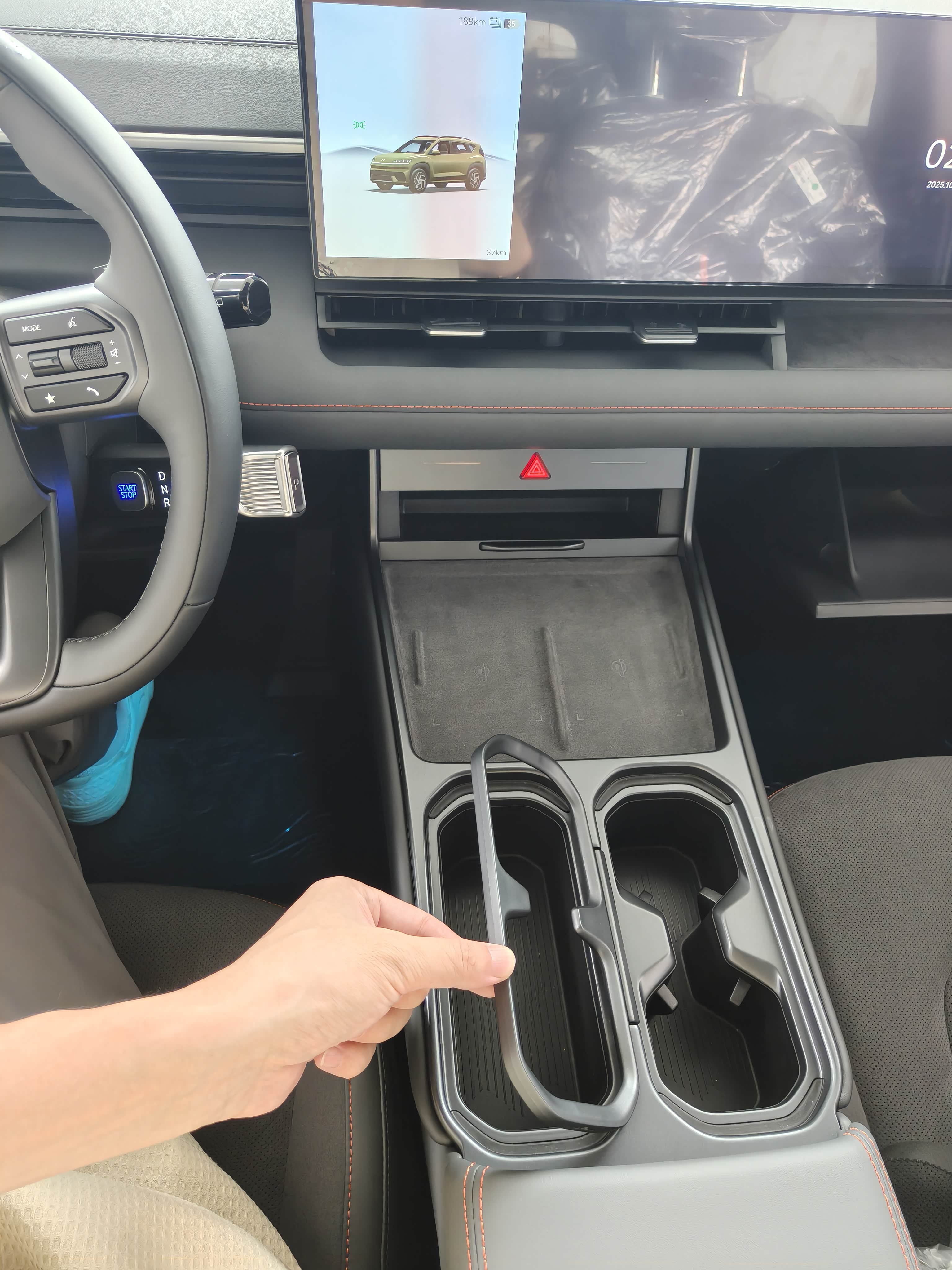 中控杯架区域增加了一个可折叠的杯架框,可以把左侧储物格也分割成2个杯架,一共4个杯架。