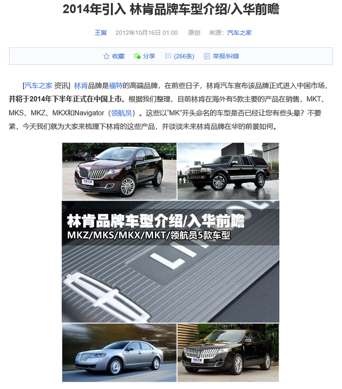 2014年林肯进入中国前夕,汽车之家的报道