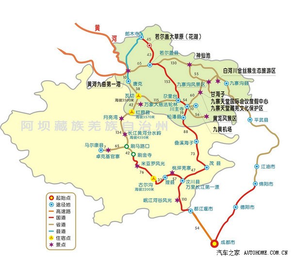 去:成都,经成灌高速、都汶高速至汶川(131公里),沿213国道经茂县、松潘、川主寺、若尔盖(336公里)