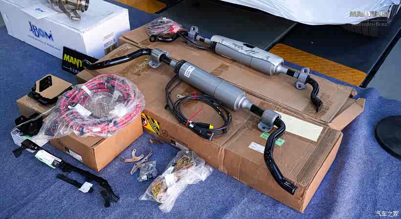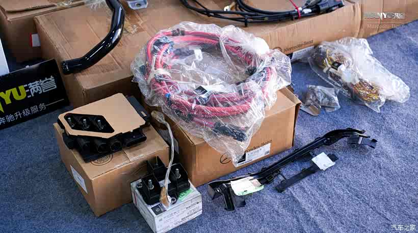 ▲ 配件展示:前后两根电子防倾杆,原厂线束,保险盒,支架,线束卡子,螺丝