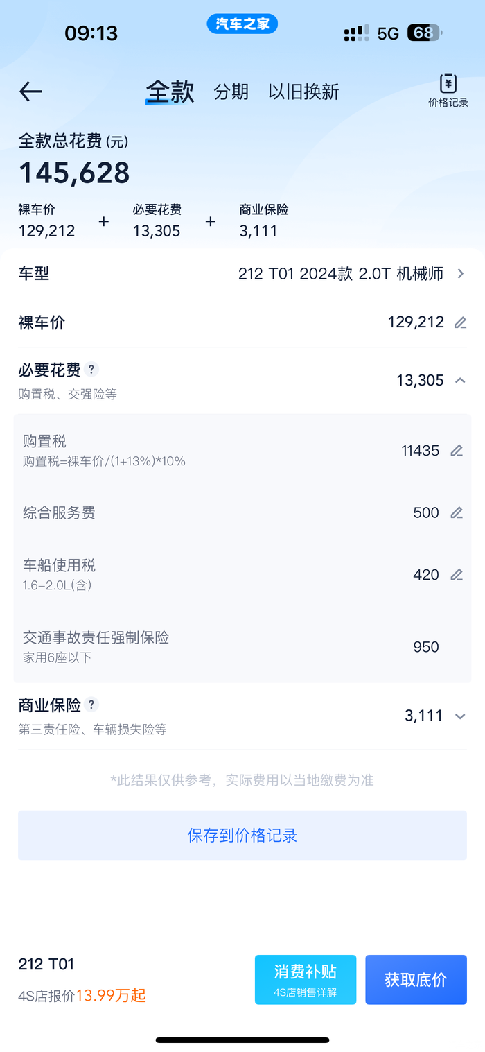 对于T01低配14万的价格,算上优惠,我能接受。裸车算14w,置换补贴6千,老车主优惠3千,1212订金抵3000,算优惠1800,这么算下来的话,裸车是12万9,购置税1.1万,保险算6000,提车价格应该在14.6左右。五千元改装基金买后锁。总价不超过15w,符合自己预期。