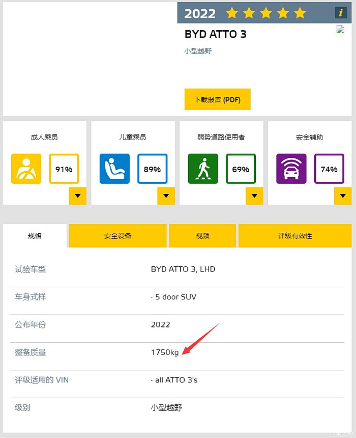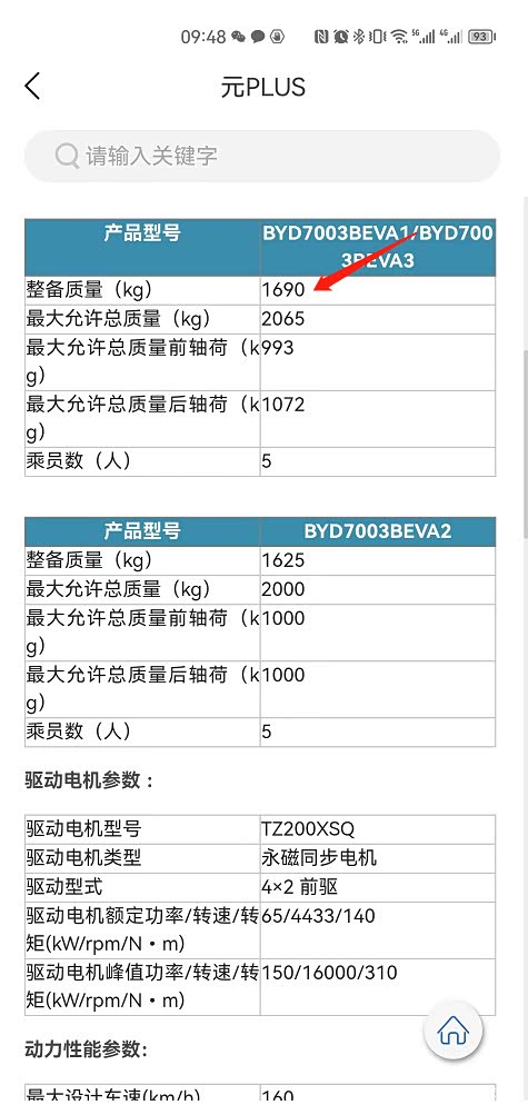 详见下图,BYD ATTO3整备质量是1750KG,国内元PLUS整备质量是1690KG