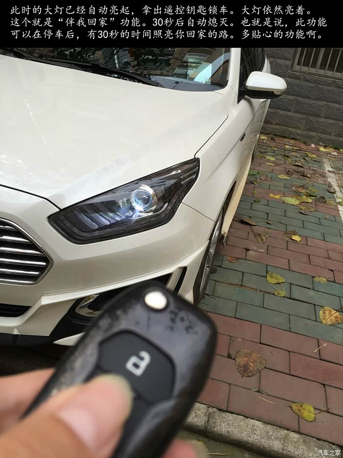其实很多车友对福特车所带有的这项其实很实用的功能并不了解。这个也只是我个人的观点而已,如果您知道,那我来进行这次的解析,也只是为了帮助那些不了解此功能的车友。 福特家族的这个功能其实对大部分的车主都很实用。伴我回家--Follow Me Home就是车灯可以延时自动关闭。 如果你的车停在家门口,并且需要走一小段路才可能走到,但是如果没有路灯。那这个功能对你来说就是福音。 下面我就用图文来详细说明这个功能如何使用。第一步: 当你把车停好。关掉大灯开关,拔下钥匙,用你的左右拨动一些大灯远近光调节的拨杆。往自己身体的位置(也就是...