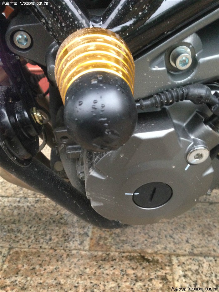 好了最后防摔胶这里真的很惊险,下午忙完上牌的手续,我就随便找了一个当地的修车店,老板要了10元帮我装好了防摔胶,然后骑到单位放下,在快下班的时候同事要看看我的车发动机的声音,结果我当时站在右边,一个手按了点火,不知道怎么挂了一档似得直接小冲出去,(后来发现挂档是不能点火的,很奇怪)然后摔倒。妈蛋的当时我快无语死了。耍帅不成还摔了车,赶紧扶起来后检查一遍才发现就这里摔了一点,真好运气。而且一摔还把油箱里面记录油量的那个浮子摔正常了。好了希望以后不摔了。并且发动前先自己检查一遍。