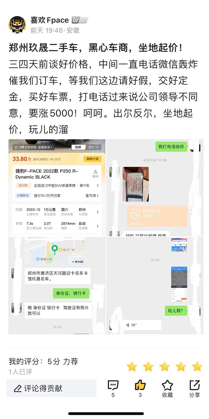 做生意挣钱天经地义,起码的行规,人和人的信任要有,这样的操作如果无人问津无人声讨,我们消费者这个角色以后永远抬不起头,也恳请汽车之家平台禁止这样的车商再发布售车信息,避免更多消费者踩坑