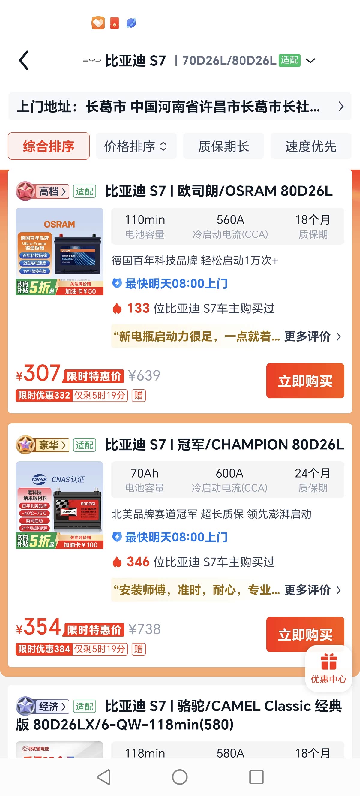 S7原车电瓶是 瓦尔塔90D26L,80Ah,低温启动电流660A