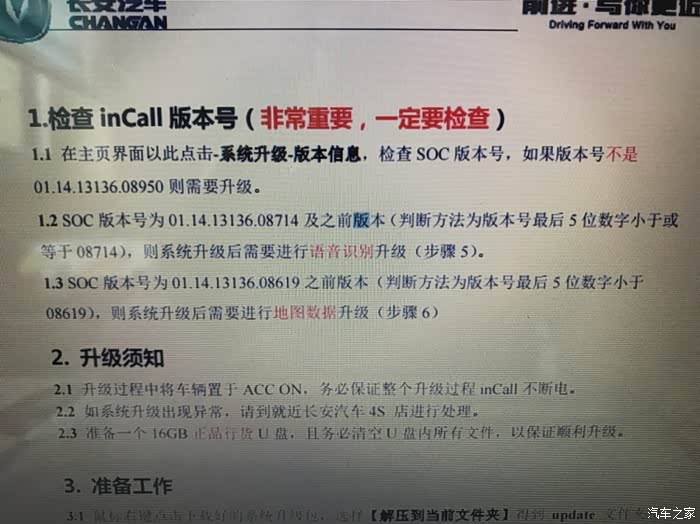 首先电脑登陆长安汽车官方网站,下载95最新的升级包,按照说明解压缩到16g或者32g的空白u盘里面,把u盘插到车上中控最下方的u盘插口里面,不睬刹车点两次一键启动让车机通电,按照官网说明升级就好了!这里的版本号一定看好旧版本注意还需要升级语音系统自动升级,切记不要断电!!至于地图,现在有个简化版可以升一下,推荐还是连上手机热点,按照自己城市需求选择性升级就好了!新版本用了一天,没感觉有啥不一样,聊胜于无吧
