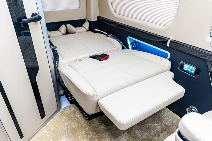 打开电动侧滑门,车内空间的精心布局令人眼前一亮。2+2+2的六座配置,每张座椅都采用顶级皮革包裹,支持多向电动调节、通风加热及按摩功能。第二排独立航空座椅可180度旋转,与第三排形成临时的会议空间。车内饰板选用天然实木与金属拉丝材质,营造出温馨而专业的氛围。智能温控系统、多区域音响及商务级隔音处理,让车内环境始终保持最佳状态。